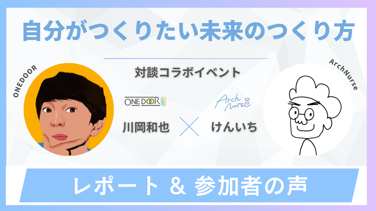 先日、川岡さん(ONEDOOR)と、けんいちさん(ArchNurse)が対談するウェビナーが開催されました。「自分がつくりたい未来のつくり方」をテーマに、それぞれのキャリア形成の経験やコミュニティ運営について、参加者を交えてキャリアの悩みや未来への向き合い方について活発な議論が交わされました。
