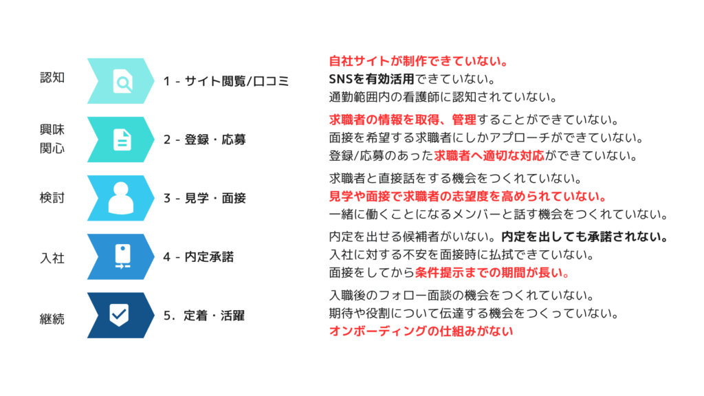 看護師の採用から定着までのプロセスは、以下の5つの段階で構成されます。多くの事業所が各プロセスで抱えている課題を洗い出していきます。